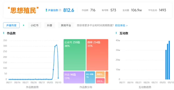 On September 7, the Xinhua Institute (新华社研究院), a think tank under Xinhua News Agency, released a report titled “Colonization of the Mind: The Means, Roots, and Global Perils of U.S. Cognitive Warfare” (思想殖民——美国认知战的手段、根源及国际危害). The report was distributed to participants at the 2025 Global South Media Think Tank High-Level Forum (全球南方媒体智库高端论坛) held in Kunming, Yunnan Province (Xinhua, September 8). It also gained traction on social media, where the term “colonization of the mind” saw a spike in exposure compared to other trending internet memes (see Figure 1). Most content related to the term originated from large accounts such as Xinhua News Agency and prominent “key opinion leaders” (KOLs), (see Figure 2).
