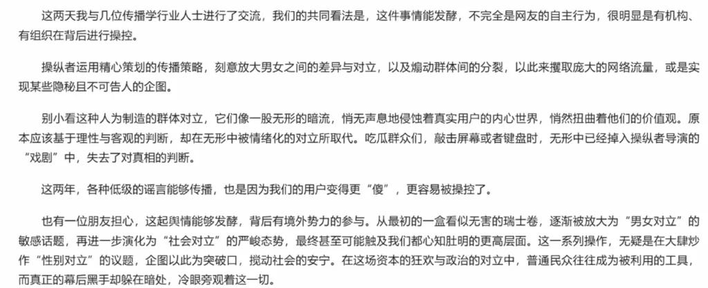 Some official media outlets and influential online commentators attribute social tensions within PRC society to foreign ideological infiltration. Over time, repeated insinuations regarding foreign interference, such as in Syria or Ukraine, have led people to believe that certain social contradictions confronting the PRC either do not exist or are exaggerated. Those who raise these issues risk being attacked: they are accused of “dai jiezou” (带节奏), a term that originated in video game livestreams to describe steering chatroom discussions for a particular purpose; alternatively, they are labeled as “foreign forces” (境外势力) seeking to undermine PRC society. In one example from 2024, a domestic dispute became a viral story, with a well-known journalist opining that online commentators supporting the wife were either being manipulated by “foreign forces”, or were “foreign forces” themselves, and accusing them of “disturbing social stability” (搅动社会的安宁) (see Figure 3).
