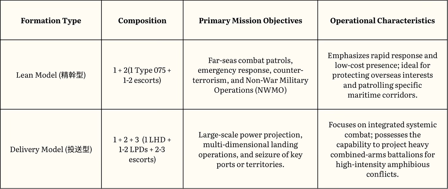 “Lean” formation (1+2): one Type 075 plus 1–2 escorts (destroyers/frigates), optimized for flexible far-seas patrol, contingency response, overseas presence, special operations forces carriage, and limited equipment packages.